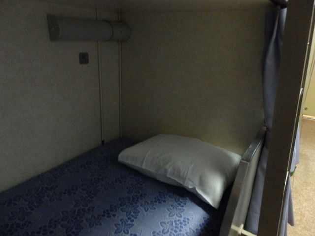 今回も2等寝台を利用しています。このタイプの船だとはじめてかな、電灯にコンセントがついていませんでした。シーツは自分で敷くタイプになっております。