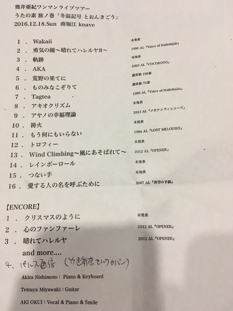 まず会場からしていつもと違うわけですが、今回はそれ以外にもそんな要素がありまして。クリスマスが近いということで5曲目から2曲讃美歌を続け、その流れで「Tagtea」もありましたし、そのあと2曲も「提供してもらった曲」で、ふだんの亜紀さんの曲とはやっぱりイメージが違ったんですよ。knaveはちょっと狭いこともあって生歌でもうしろのほうまで届いてたし、こんな形で亜紀さんのルーツに触れることができたのもよかったです。あたらしい曲もいっぱいだったし、そのなかで「もう何にもいらない」や「AKA」などの昔の曲もしっかり効いてたし。あっという間の2時間半、いつもながら素敵な時間でございました。そしてアンコールは去年作ったという「クリスマスのように」のあと、そこまで出ていなかった「心のファンファーレ」「晴れてハレルヤ」でにぎやかに終わり、GtとEpfのおふたりが退場されました。