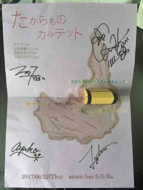 たからものカルテットはアヤヲ(Vo),山田明義(Gt&Vo),花田えみ(Pf),池田安友子(Per)のユニットで、山田さんが3曲くらい歌った以外はアヤヲさんの声での演奏でした。途中で休憩をはさみつつ前半6曲後半7曲(+アンコール)って意外と歌ってないんだ、実質2時間くらいあったと思うのにけっこうMCが多かったんだな。